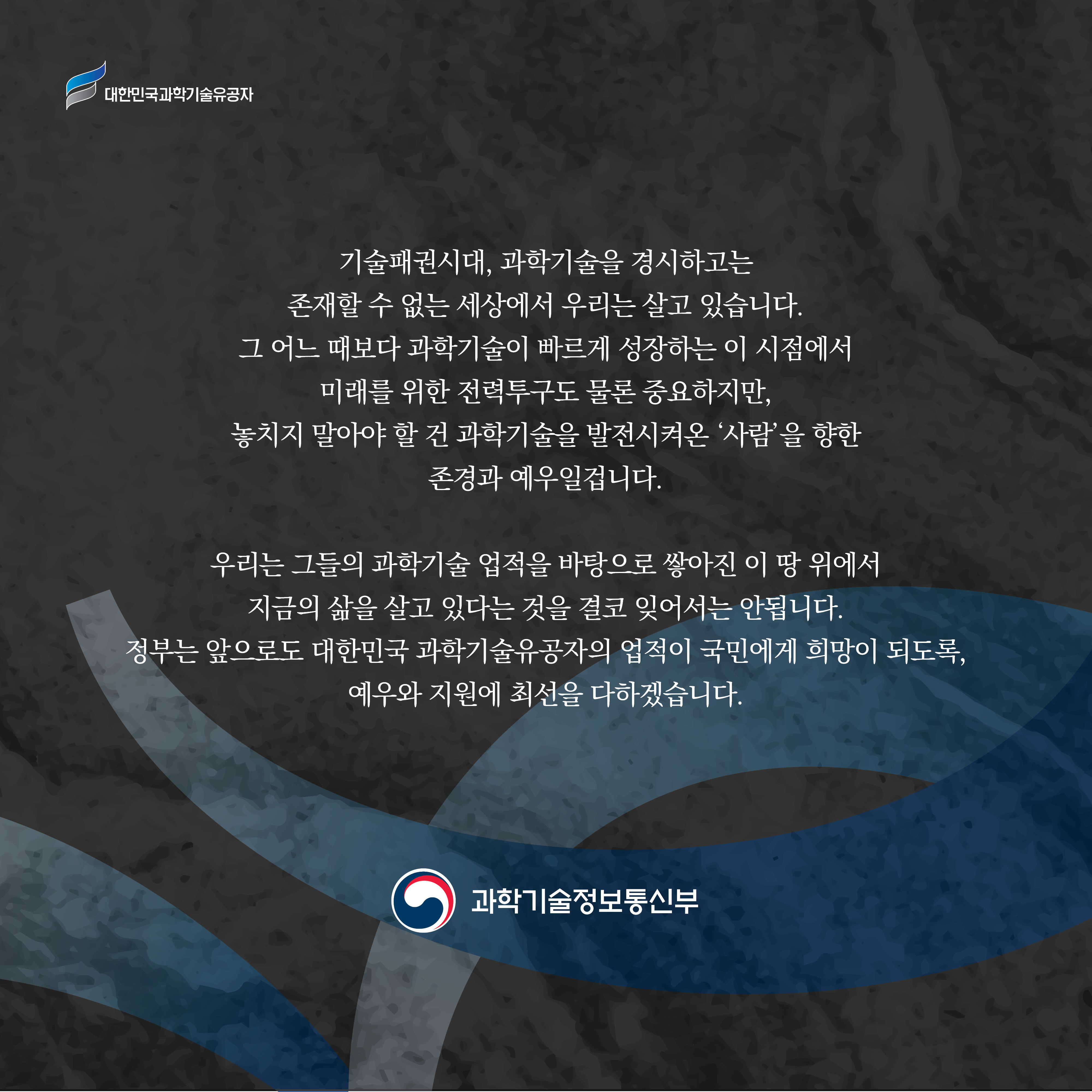 故 김정흠 박사 타계 20주기 추모 스토리 지금 우리가 기억해야 할 과학기술유공자 "한국의 과학문화를 대중 속 깊이 뿌리내리게 한 김정흠 박사를 기억해주세요." 故 염영하 박사 타계 30주기 추모 스토리 지금 우리가 기억해야 할 과학기술유공자 "한국 전통 범종의 신비를 입증한 한 명의 과학자, 염영하 박사를 기억해 주세요." 한국 기업의 R&D 역사를 바꾼 바이오산업의 전설 LG화학 연구소를 주도하며 팩티브를 비롯한 신약 개발에 기여 선경을 글로벌 기업으로 이끈 폴리에스터 필름 제조기술 개발 기업 연구소의 성공 모델 제시와 바이오벤처 기업가의 배출 국가의 미래를 설계한 과학기술행정가 의약품·농약 성분 국산화와 정밀화학 산업 기반 구축 물질특허 시대를 대비한 신물질 창출 연구체제 확립 과학기술연합대학원대학교 설립 등 과학기술 진흥정책 주도 세포 신호전달 연구의 세계적 선구자 포스포라이페이스 C(PLC) 아이소자임 발견 등 세포 신호전달 연구의 기틀을 마련 퍼옥시레독신(Prx) 항산화효소 발견 등 산화환원 생물학 분야를 개척 이화여대, 연세대, 기초과학연구원 등 한국 생명과학 기반 강화에 기여 한국 국방연구개발의 기틀을 닦은 연구관리자 번개사업의 성공적 완수로 기본 병기 국산화 달성 장거리 지대지 미사일 백곰 개발 사업 주도 국내 최초의 품질보증제도 구축으로 공업기술의 표준화 및 규격화 기여