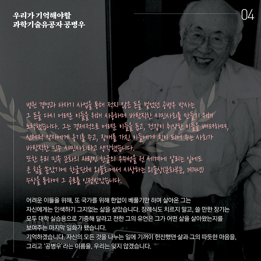 故 공병우 박사 타계 30주기 추모 스토리 작성자 익명 작성일 2025-03-07 조회수 9092 지금 우리가 기억해야 할 과학기술유공자 "한글 기계화를 선도한 한국 최초 안과학 박사 공병우" 목록 다음글 ▲ 대한민국을 빛낸 과학기술유공자를 찾습니다 이전글 ▼ 故 한필순 박사 타계 10주기 추모 스토리 지금 우리가 기억해야 할 과학기술유공자 "한국 원자력 기술을 세계적 수준으로 이끈 한필순 박사를 기억해주세요."